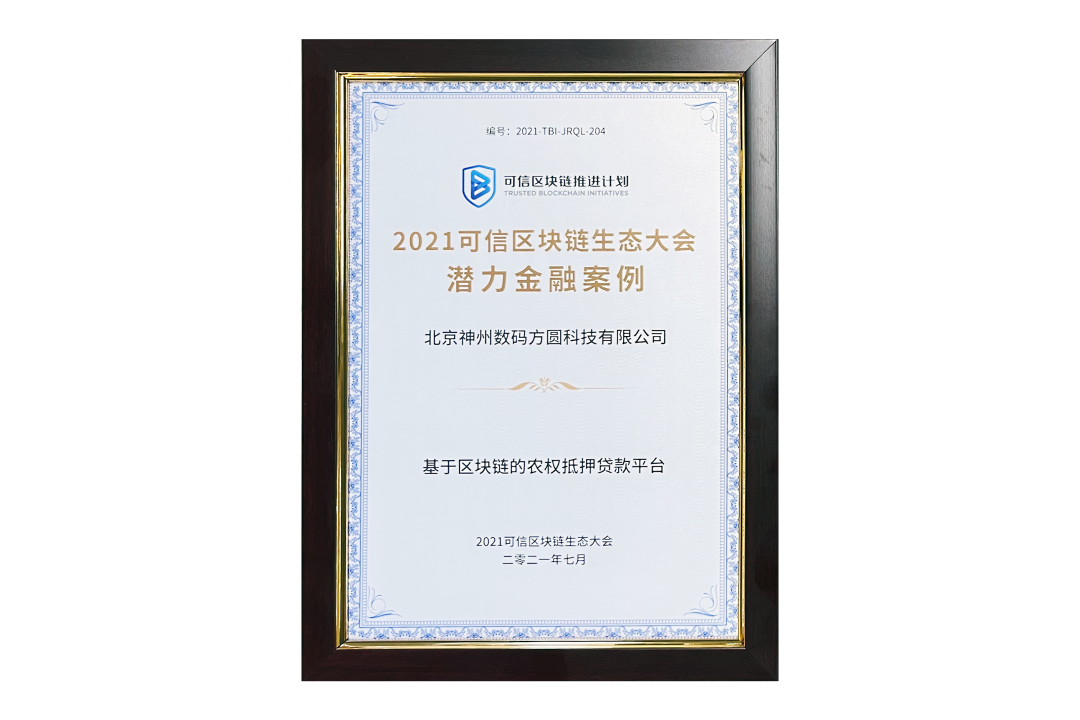 7月13日,由中国信息通信研究院、可信区块链推进计划主办的“2021可信区块链生态大会”在京举办,并隆重发布系列成果。神州信息子公司北京九游ninegame方圆科技有限公司(简称:神州方圆)推荐的“基于区块链的农权抵押贷款平台”荣获十大金融应用高潜力案例,为“区块链+农业”落地带来示范效应。
