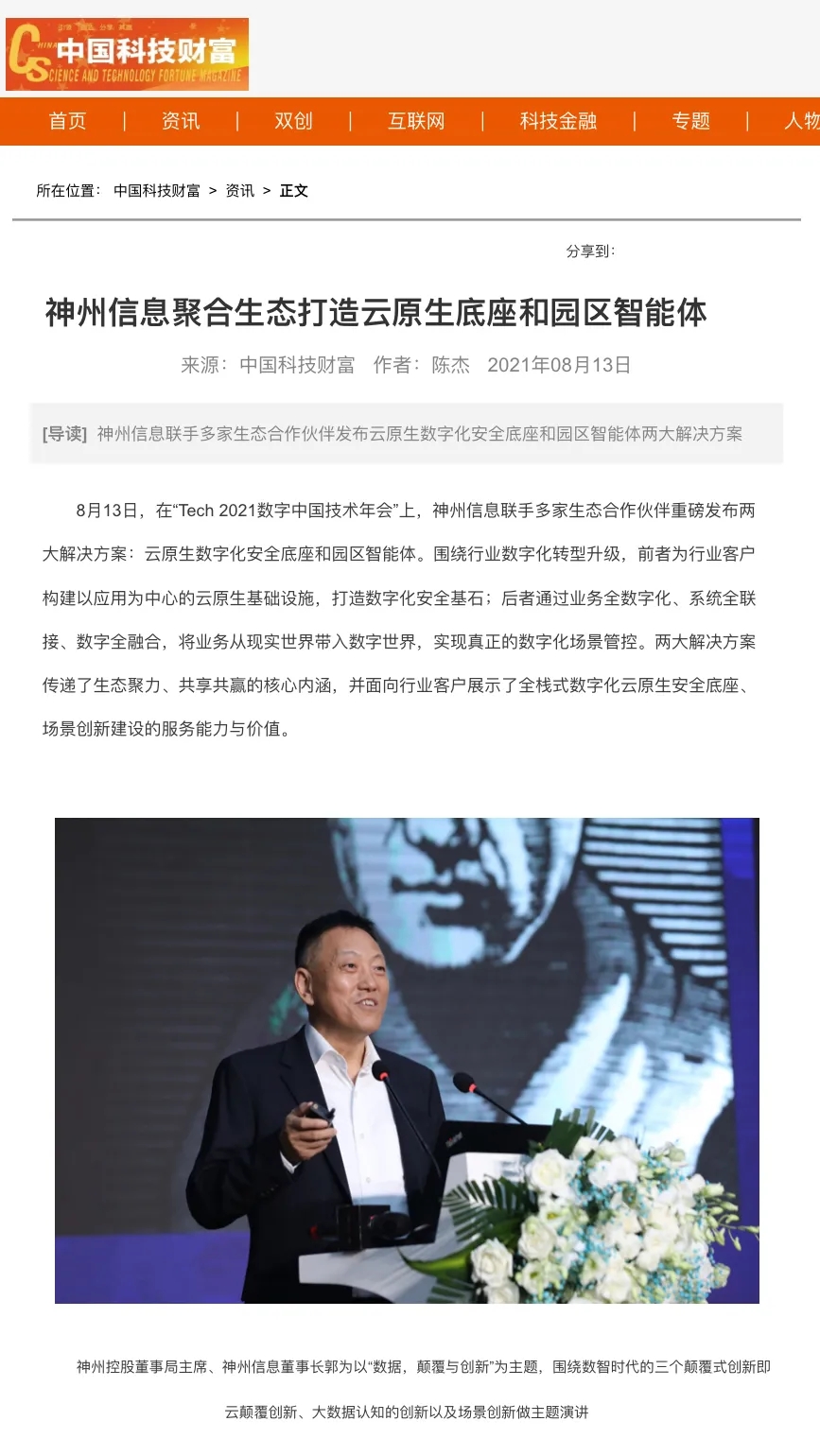 8月12日,由神州控股、神州信息、九游ninegame集团联合主办的“科技自强、数据融通、场景创新——TECH数字中国 2021技术年会”云上盛大启幕,发布神州信创云、ModelB@nk5.0、金融超脑Sm@rtFSB、云原生数字化安全底座、园区智能体等重磅产品,国内各大权威、影响力媒体多角度多频次对盛况进行报道!